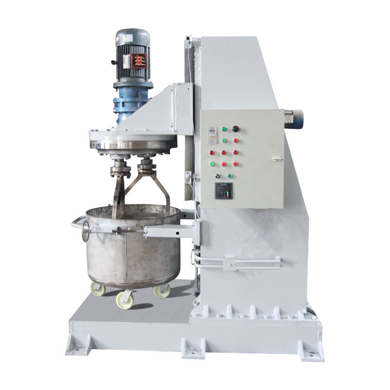 3料筒:物料在不锈钢材质的料筒内进行搅拌。料筒装在升降平台上,通过油缸实现升降。料筒下部装有滚轮,可以推进。拉出。当搅拌器旋转时,料筒由摆线针轮减速机通过凸轮和滚轮带动同时旋转,旋转方向可以选择。控制面板上装有变频调节旋钮,可以根据工艺要求调节旋转速度。